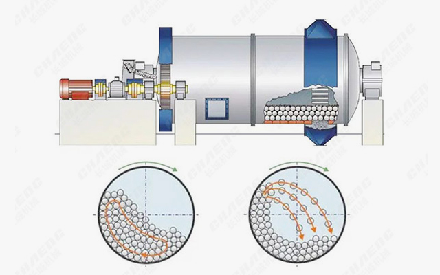 物料由進料裝置經入料中空軸螺旋均勻地進入球磨機第一倉,該倉內有階梯襯板或波紋襯板,內裝不同規(guī)格鋼球,筒體轉動產生離心力將鋼球帶到一定高度后落下,對物料產生重擊和研磨作用。物料在第一倉達到粗磨后,經單層隔倉板進入第二倉,該倉內鑲有平襯板,內有鋼球,將物料進一步研磨。粉狀物通過卸料箅板排出,完成粉磨作業(yè)。