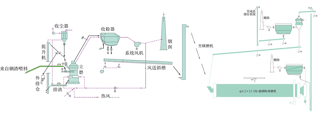 來自立磨系統(tǒng)的鋼渣粉,由提升機(jī)輸送至超細(xì)球磨機(jī)內(nèi)進(jìn)行粉磨,超細(xì)球磨機(jī)出口處配有收塵器對揚(yáng)塵處收塵;粉磨后物料由提升機(jī)送至選粉機(jī)進(jìn)行選粉,比表面積≥ 650 ㎡ /kg 的成品超細(xì)粉由收粉器進(jìn)行收集后通過空氣斜槽送至成品提升機(jī)入庫;不合格細(xì)粉從選粉機(jī)底部出口經(jīng)過空氣斜槽返回超細(xì)球磨機(jī)入口,重新進(jìn)入球磨機(jī)內(nèi)粉磨,直至粉磨成為合格超細(xì)粉。