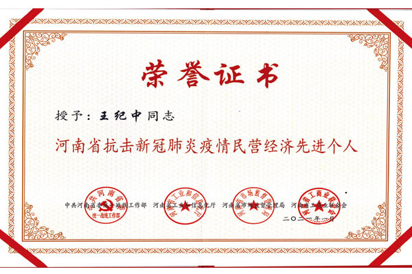 4月,河南省抗擊新冠肺炎疫情民營經(jīng)濟(jì)*個人評選表彰活動中,聯(lián)合授予長城機(jī)械董事長王紀(jì)中河南省抗擊新冠肺炎疫情民營經(jīng)濟(jì)*個人。