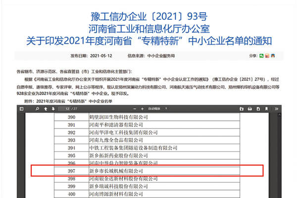 5月,新鄉(xiāng)市長城機(jī)械有限公司憑借過硬的綜合實(shí)力成功入選2021年度河南省“專精特新”中小企業(yè)名單。