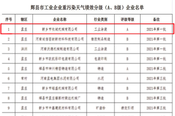9月,新鄉(xiāng)市長城機(jī)械有限公司順利通過第一批省環(huán)保廳A級企業(yè)績效評定。