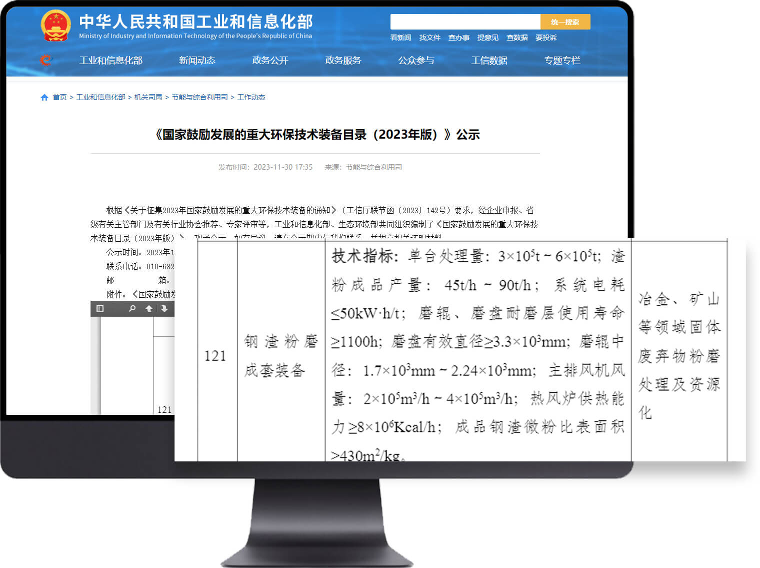 近日,工業(yè)和信息化部、生態(tài)環(huán)境部對《國家鼓勵發(fā)展的重大環(huán)保技術(shù)裝備目錄(2023年版)》進行公示,新鄉(xiāng)長城申報的“鋼渣粉磨成套裝備”成功上榜!